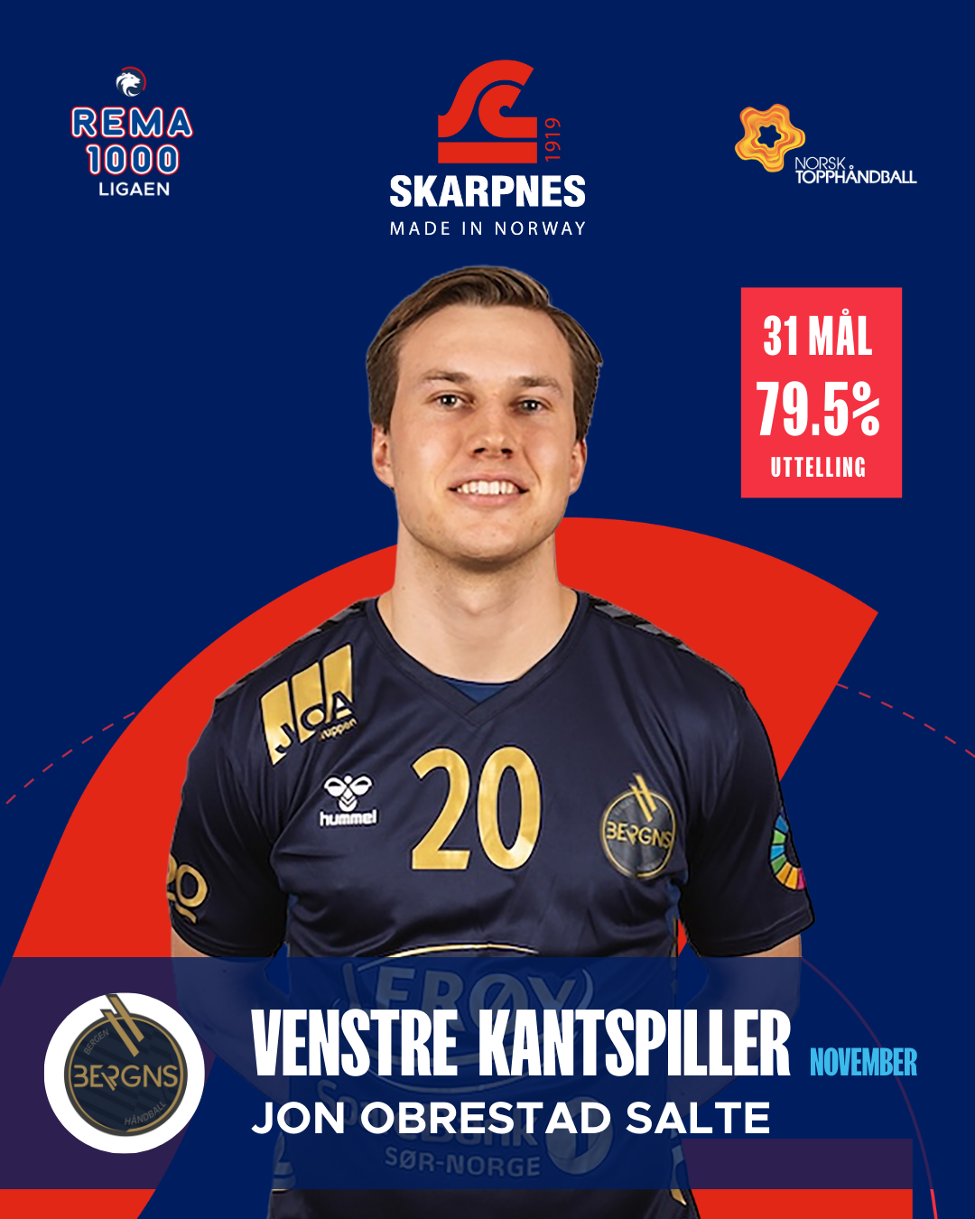 På venstrekanten har Jon Obrestad Salte levert en strålende novembermåned. 31 scoringer på fire kamper og en uttellingsprosent på 79,5 viser en spiller som har vært både effektiv og stabil. Med nær åtte mål i snitt per kamp har han vært en av Bergens farligste våpen.