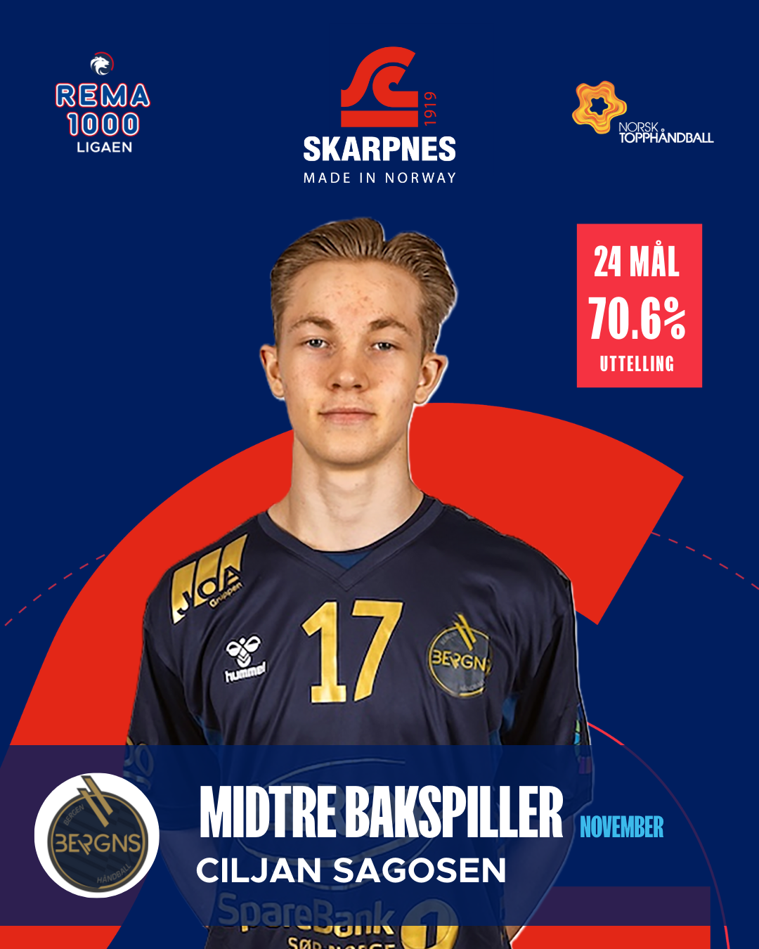 Bergens midtre bakspiller Ciljan Sagosen styrte spillet med stor ro og effektivitet gjennom november. 24 scoringer, 26 assists og 70,6 % uttelling viser en spiller som både skaper og avslutter. Han har vært lagets motor og en av de mest komplette playmakerne i ligaen denne perioden.